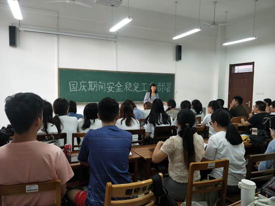 为贯彻落实学院党委《关于做好国庆期间安全稳定工作的方案》精神,增强同学们的安全意识。9月26日下午,学院全体研究生分别在s楼411、412教室召开“安全稳定主题班会。研究生辅导员赵岩老师主持班会。