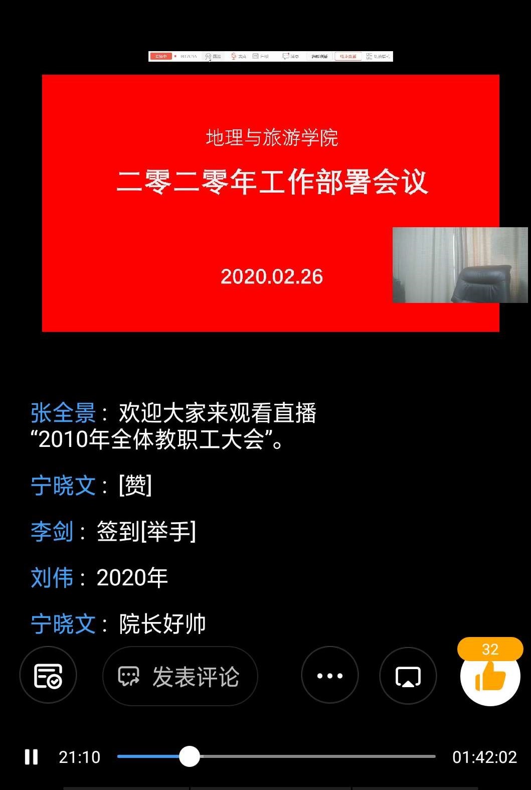 2020年2月26日下午,学院通过钉钉视频召开全体教职工新学期工作会议。学院领导苏占兵、张全景、刘伟、吕晓、吴军、于伟等出席,学院全体教师参加会议。