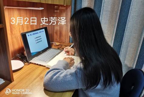 由于新冠疫情,新学期我们采用新的上课方式——线上教学,我的感觉是新鲜又兴奋,这是第一次体验这种上课模式,但是线上教学与线下教学还是有很多不同的,比如老师每次提问都要连麦,还会出现延迟,卡顿,不过我仍然感觉到了老师对每节课都很负责,会时不时间我们有没有听清楚,能不能跟上进度,老师的教学热情,即使是对着屏幕,但跟在讲堂上依然没有差别,因此,我能够学习到许多新知识,虽然老师教的非常认真也非常细致,但是为保证学习效果,课后还是需要要认真复习。