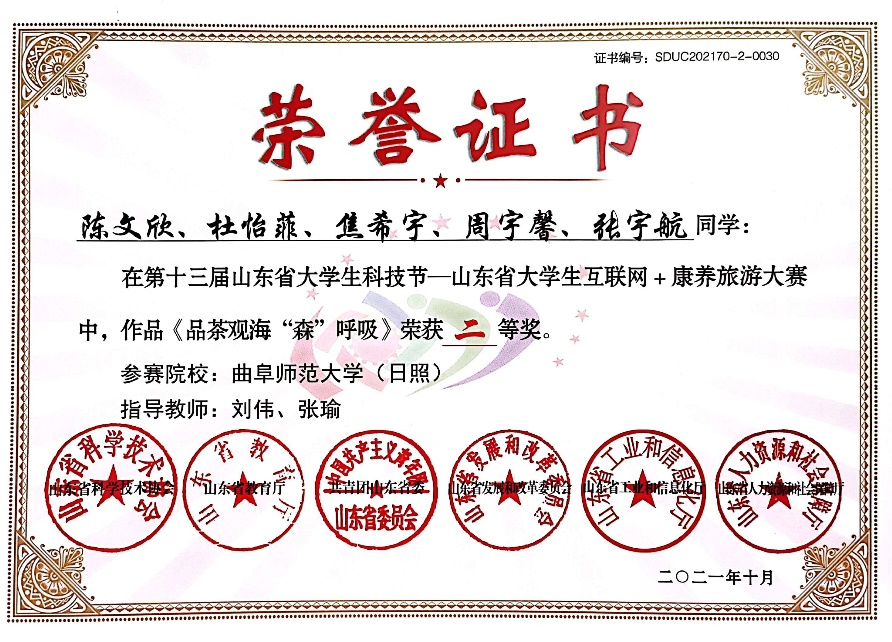 2020级本科生陈文欣、杜怡菲、焦希宇、研究生张宇航以及政治与公共管理学院周宇馨组成的《品茶观海“森”呼吸》项目团队,在指导老师刘伟、张瑜指导下斩获省级二等奖。
