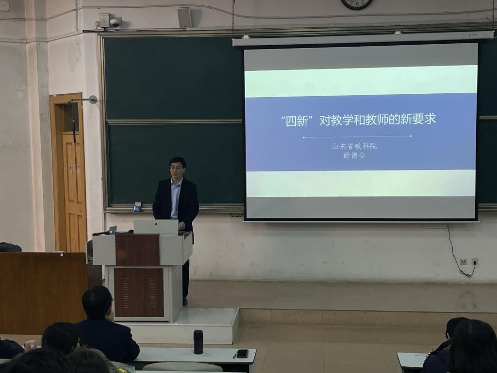 于E101举行【经纬讲堂】专家报告会。本次报告,特邀山东省教科院高中地理教研员、山东省教学能手舒德全老师,以“‘四新’对教学和教师的新要求”为题做报告。地理科学师范专业教育实习导师、学科教学(地理)研究生导师、2019级地理师范生听取了报告。学院副院长吴军教授主持报告会。