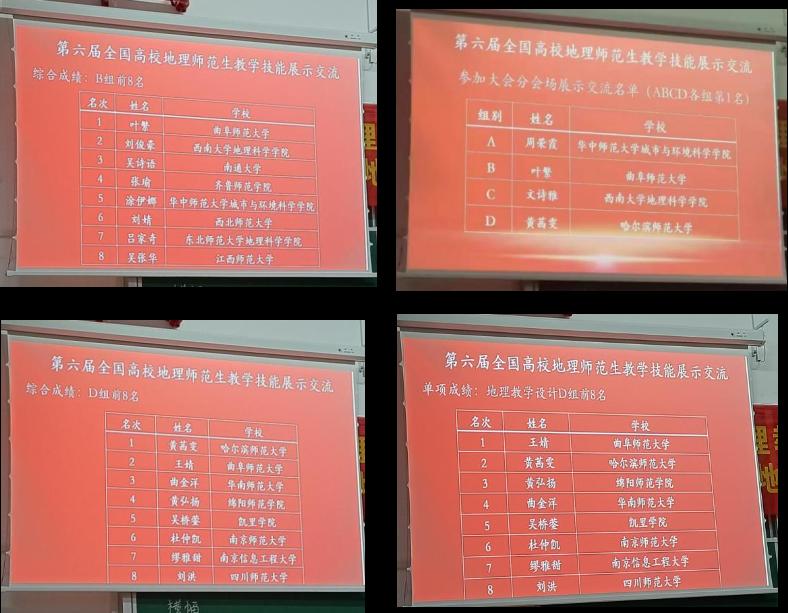 派出的参赛选手地理科学(师范)专业2020级叶繁同学、2021级王婧同学分别在李剑老师和刘庆果老师的指导下,获得B组第一名和D组第二名的优异成绩。叶繁同学被推选参加全国综合学术年会展示交流活动。据悉,全国师范高校仅有四位优秀同学面向全国地理教学界进行展示。