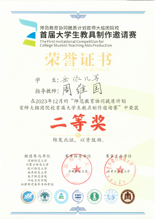 学子表现突出,取得优异成绩。张雨雯、张誉文、周小惠同学(指导教师:周维国)的作品《五大地形地貌》,袁欣然、袁雨霞、岳依凡同学(指导教师:周维国)的作品《火山地貌及景观教具》获得二等奖。杨子涵、杨中冉、于佳卉同学(指导教师:王伟)的作品《河流地貌模型教具》,马晨旭、付丰赫、纪晓萱同学(指导教师:孟令冉、梁甜甜)作品《探索太阳系》获得优秀奖。本次竞赛为学生搭建了展示师范技能的平台,充分展示了麻豆在线