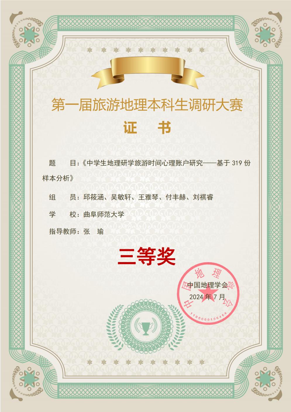 学生踊跃报名,其中邱筱涵、吴敏轩、王雅琴、付丰赫、刘祺睿的调研作品《中学生地理研学时间心理账户研究——基于319份样本分析》在张瑜老师的指导下进入总决赛,并荣获全国三等奖。