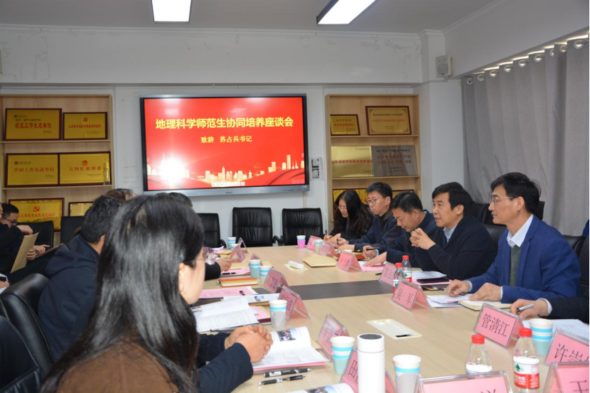 座谈会上,苏占兵记首先对各实习学校领导的到来表示热烈欢迎,并从学科建设、专业发展、师资力量、人才培养特色等方面介绍了学院发展基本情况。地理科学系主任周维国解读了地理科学(师范)专业培养方案,重点阐释教育“三习”环节的目标定位与实施流程,为校地协同培养提出了具体路径。