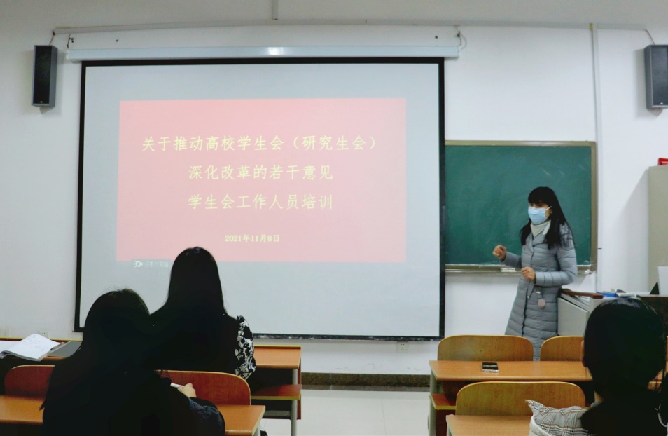 研究生会于JS411教室召开《关于推动高校学生会(研究生会)深化改革的若干意见》学习培训会。研究生辅导员赵岩到会指导,崔硕担任本次培训会议主讲人,研究生会干部参加会议。会议由研究生会主席韩善梅主持。