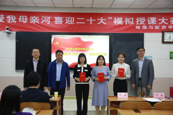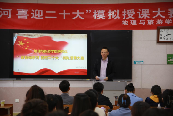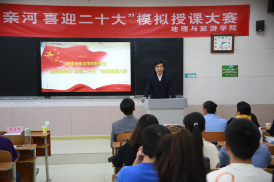 研究生党支部与研究生团支部在S206联合开展“爱我母亲河,喜迎二十大”模拟授课比赛,学院党委书记苏占兵出席并讲话,学院副院长吴军、于伟、学院教学督导及教职工党支部书记刘志刚、学科教学(地理)专业学位点负责人吕宜平以及李剑、李瑞平、孙丕苓等七位老师担任比赛评委,比赛由麻豆在线
