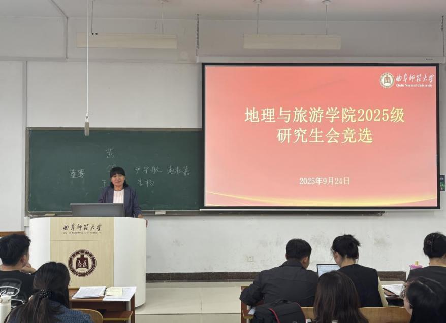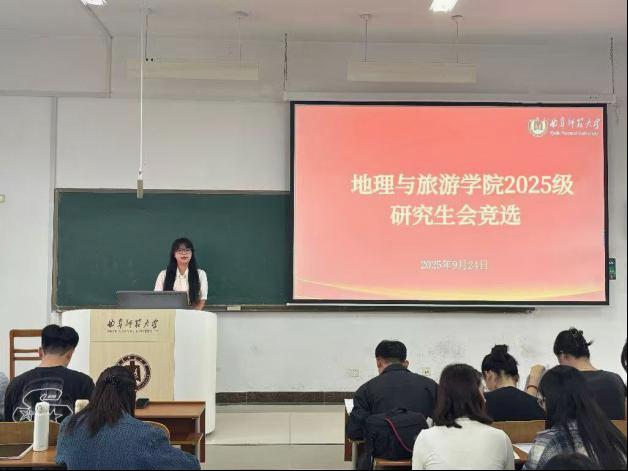 于S413教室举行2025级研究生会纳新暨班委竞选大会。地理与旅游学院研究生辅导员赵岩、2025届和2026届研究生会主席团出席会议并担任评委。会议由研究生会主席杭庆厚主持,2025级全体研究生参加。