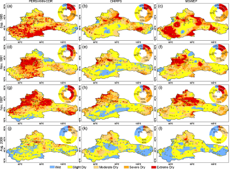郭浩青年副教授团队,依托山东省高校“青创人才引育计划”创新团队和国家自然科学基金青年项目,对三种时序超过30年的主流遥感卫星降水产品(PERSIANN-CDR、CHIRPS和MSWEP)在西北地区干旱监测方面的适用性进行了系统评价。研究表明:三种降水产品在估算降水和描述干旱事件方面表现较好,但存在干旱持续时间高估引起的干旱严重度高估问题。CHIRPS产品在降水和干湿状况反演方面能力有限;PERSIANN-CDR倾向于高估降水,进而导致严重干旱事件的程度和影响面积的高估问题;MSWEP在识别干旱事件和描述干旱特征方面优于其他两个产品。由此,在西北地区进行长时间序列遥感干旱监测应用中可优先考虑使用MSWEP数据集。