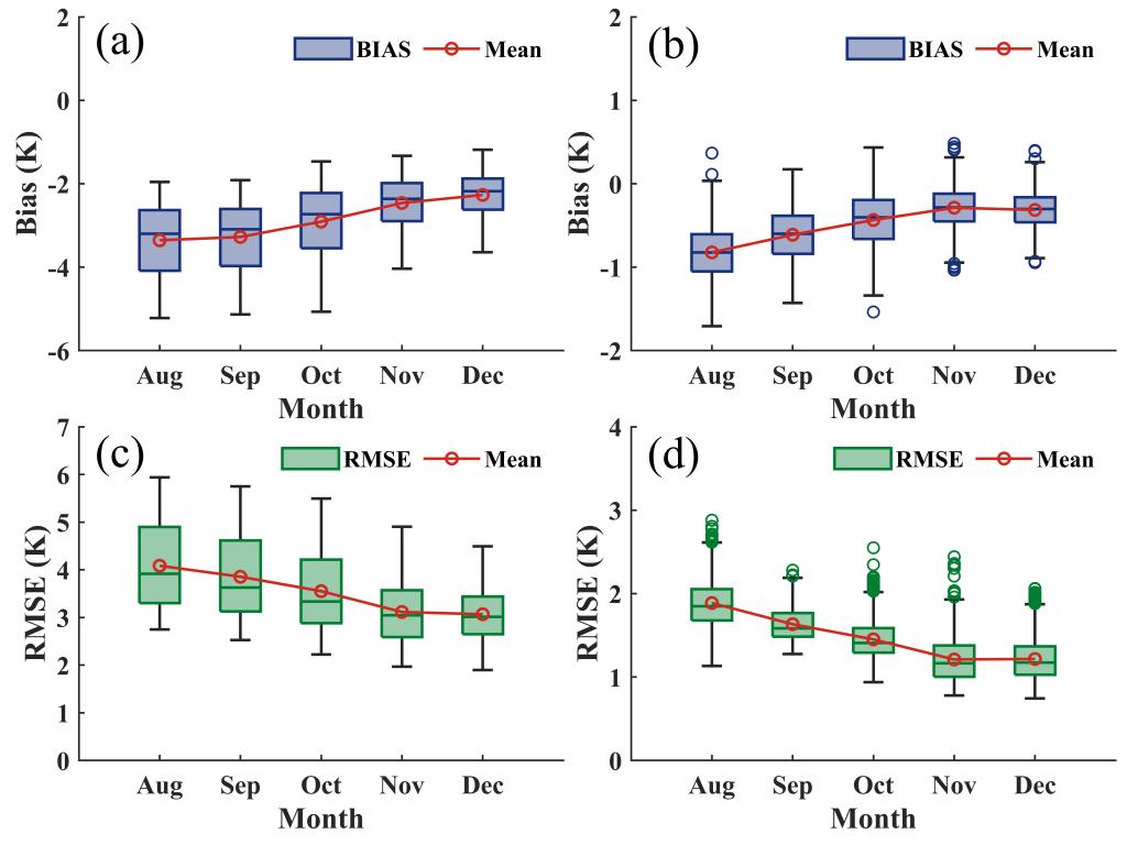 孟翔晨博士研究组运用站点验证、交叉验证等方法,对我国风云四号A星(FY-4A)官方地表/海表温度产品进行了精度评价,并提出了实用性方案来改进地表温度的反演精度。研究结果显示: