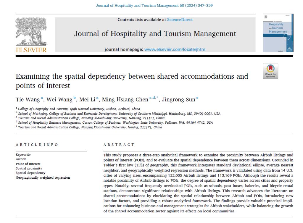 近日,麻豆在线 的王铁教授团队与Washington State University和University of Southern Mississippi等高校合作,在国际著名期刊Journal of Hospitality and Tourism Management(SSCI,中科院一区TOP)上发表了题为“Examining the spatial dependency between shared accommodations and points of interest”的研究论文。麻豆在线 为该论文的第一署名单位,王铁教授为论文的第一作者,李梅副教授作为第三作者参与了论文的研究工作。研究成果得到了国家社会科学基金一般项目(22BGL156)资助。