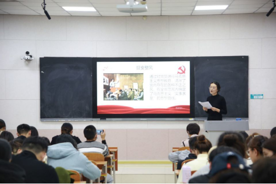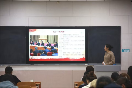 宣讲团成员吕超伟围绕“坚持和发展中国特色社会主义的政治宣言和行动纲领”主题,就了解党的二十大的基本概况、领会党的二十大精神的意义、掌握党的二十大精神的主旨思想、以及二十大的主要内容和落实二十大精神的基本要求五项重点展开详细的阐述。谭浩围绕“万山磅礴看主峰,党建引领事业兴”的主题,详细说明党的精神建设、思想建设、组织建设、作风建设、制度建设等等一系列党的建设协同工程,党建从理想信念和精神支柱、干部队伍、党内法规制度等诸多方面为党妥善应对革命、建设和改革等不同时期的困难和挑战。宣讲过程中,同学们聚精会神,认真记录,呈现出积极向上的良好氛围,纷纷表示受益匪浅。