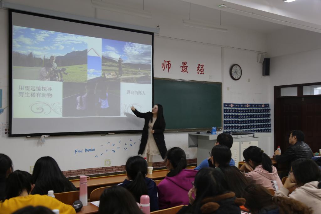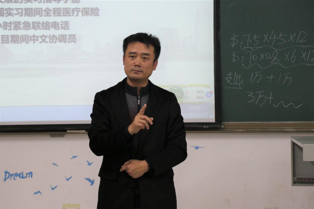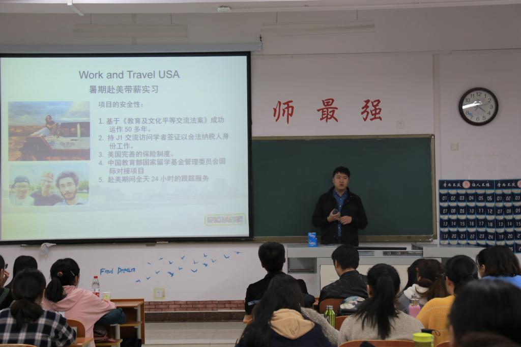 活动伊始,叶德舜首先对IEC国际文化交流中心做了简要介绍,并就项目安全性、工作与职位、薪资待遇、住宿条件等几个方面对带薪实习活动进行讲解。他讲到:通过此次项目,可以深入体验美国社会,在纯英语语言环境中提升英语水平,开拓一个国际化的视野。随后,一位实习亲历者,向我们介绍饮食、住宿、交际等方面的情况。她谈到:三个月的深入接触解美国本土生活,听力及口语均大有提升,独立生活能力有所提高,并结交了许多国际朋友,这对同学们来讲意义重大。