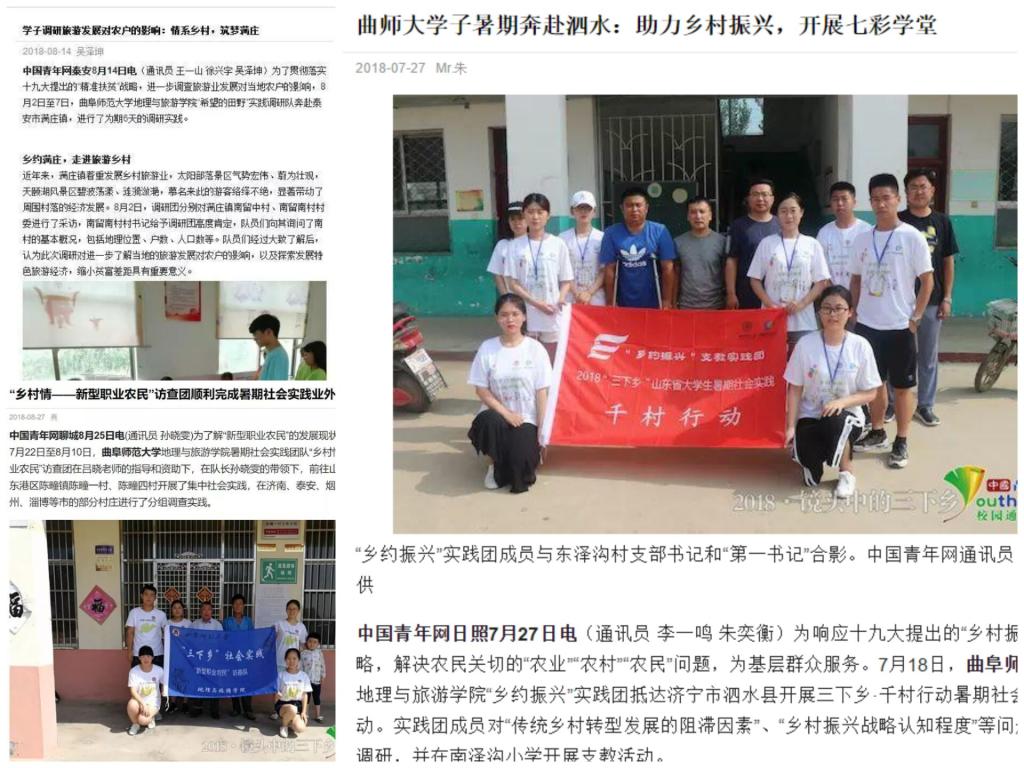 “乡约振兴”实践团抵达济宁市泗水县开展“三下乡·千村行动”暑期社会实践活动,我们选取小切口,对“传统乡村转型发展的阻滞因素”“乡村振兴战略认知程度”等问题进行调研,并在南泽沟小学开展支教活动。我们撰写的《曲师大学子暑期奔赴泗水:助力乡村振兴,开展七彩课堂》稿件,分别被中国青年网、中国山东网、大众网采用。