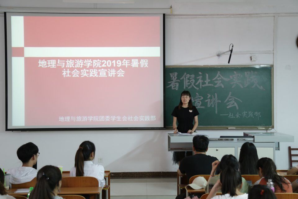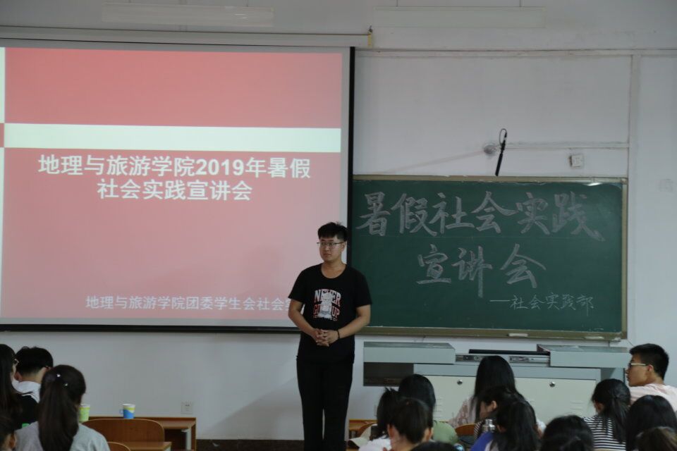 在2019年暑假社会实践中取得佳绩。社会实践部部长宗宇根据学校及学院相关工作要求对2019年暑假社会实践文件进行详细剖析,为同学们如何选题提供了具体建议,她鼓励同学们结合相关专业,提出有创意的想法,投身于社会实践的活动中,锻炼和磨砺自己。最后,贺静怡对本次宣讲会作出总结,她建议同学们不忘初心,端正态度,运用自己的专业知识和技能,保持旺盛的活力和朝气,以饱满的激情和旺盛的斗志接触社会、了解社会、服务社会,在实践中争做优秀地理人。