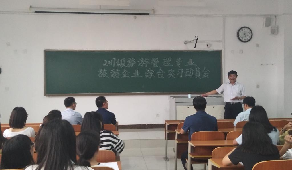 2017级旅游管理专业学生旅游企业综合实习在S楼407教室举行。出席本次动员会的领导老师有:学院党委书记苏占兵、院长张全景、党委副书记刘伟、副院长吴军、指导教师武传震、张岩君、闫颖、邓薇,2017级辅导员刘翔。会议由旅游管理系主任石峰主持。