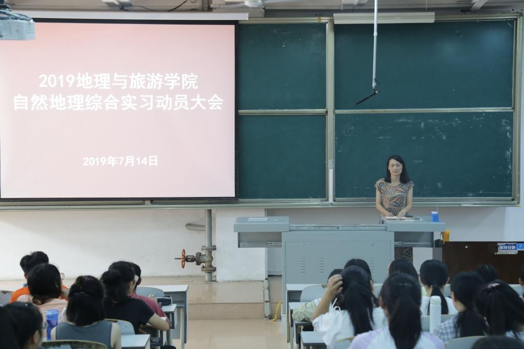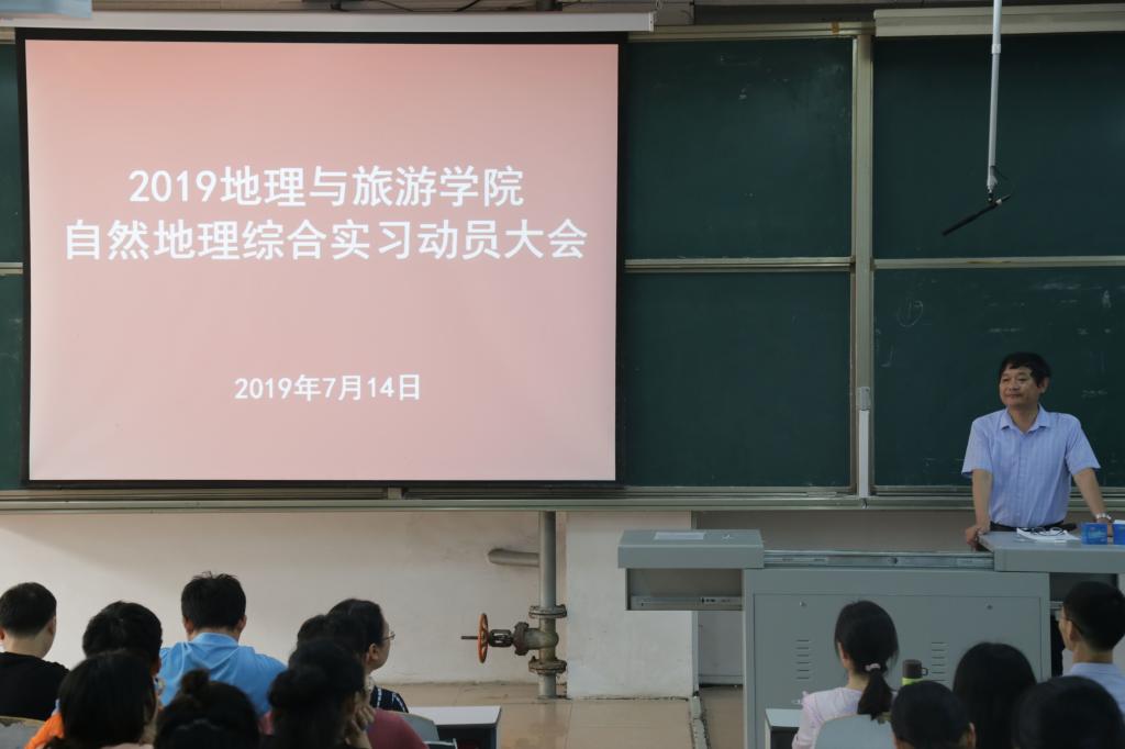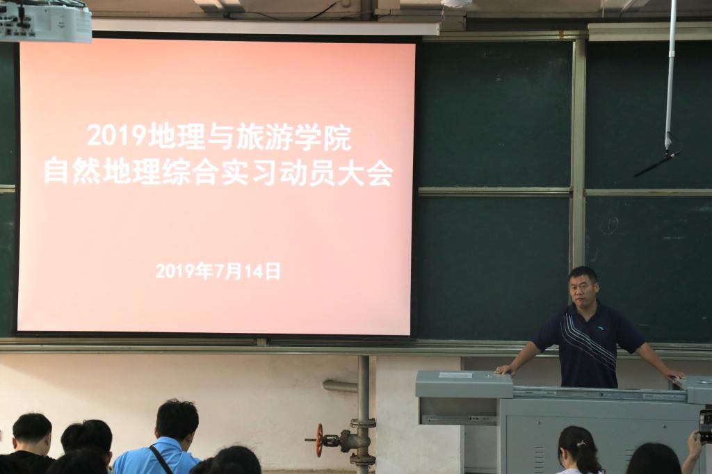 于7月14日在E105召开2019年自然地理综合实习动员大会。本次会议由刘飞博士主持,院长张全景、党委副书记刘伟、副院长吴军、团委书记宁晓文及刘艳、秦霞、孙丕苓、王振海、赵爽相关专业教师出席,2018级地理科学专业学生和公费师范生参加。