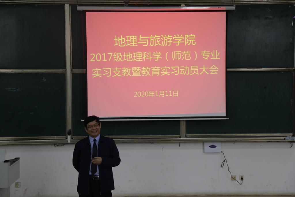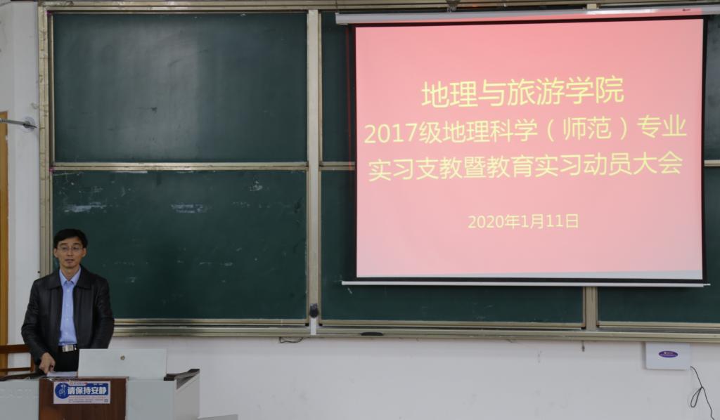 于1月11日下午召开2017级地理科学(师范)专业实习支教暨教育实习动员大会。院长张全景教授,党委副书记刘伟,出席,副院长吴军副教授主持会议,全体教育实习指导教师、2017级地理科学(师范)专业辅导员、班主任和全体同学参加了动员大会。