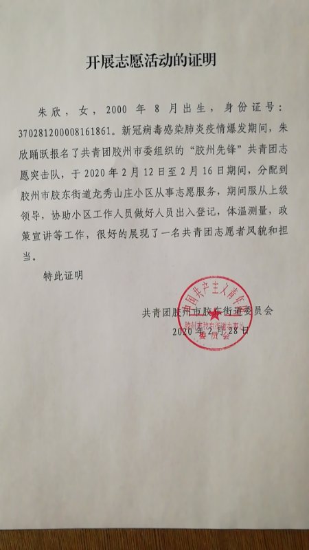 2020年新春伊始,新型冠状肺炎在湖北武汉爆发,随之全国范围内多省陆续出现确诊病例,一场没有硝烟的战争爆发在这个春节。各市市委、市全市人民坚决贯彻习近平总书记重要讲话和指示批示精神,万众一心,众志成城,坚决落实防控措施,向各街道征集志愿者,全力防范疫情扩散蔓延。朱欣同学踊跃报名了共青团胶州市委组织的“胶州先锋”共青团志愿突击队,在龙秀山庄小区进行疫情防控登记工作。工作期间正值复工返回的密集时段,朱欣在社区防疫点对外市返回的居民进行登记,测量体温,询问返回人员的具体路径。并在下班高峰期协助其他志愿者对本小区外出工作人员进行登记。疫情好转时,朱欣同学也仍一刻不放松,带头遵守各项防空规定,抵制陈规陋习,及时面向居民发布权威信息,准确解读防控措施。她感叹道:“身为在校大学生,在面对新冠肺炎这种严峻的环境下,我的所作所为与奔赴湖北的医护人员相比甚是渺小,但只要全国人民团结一心,一定可以打赢这场疫情防控战争!”