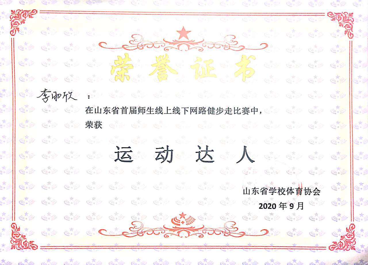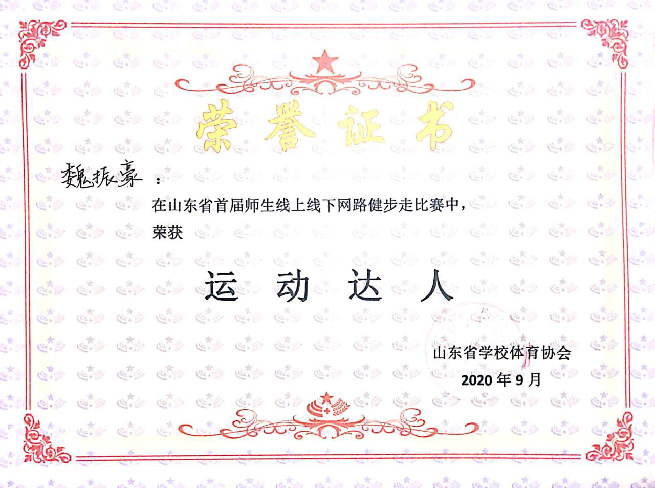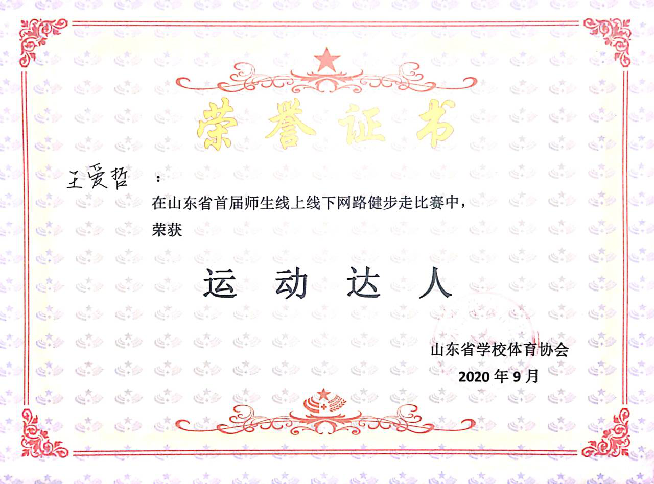 团队荣获“团体一等奖”与“优秀组织奖”,郑子琦、魏振豪、王爱哲、李雨欣4名同学荣获“运动达人”的称号。
