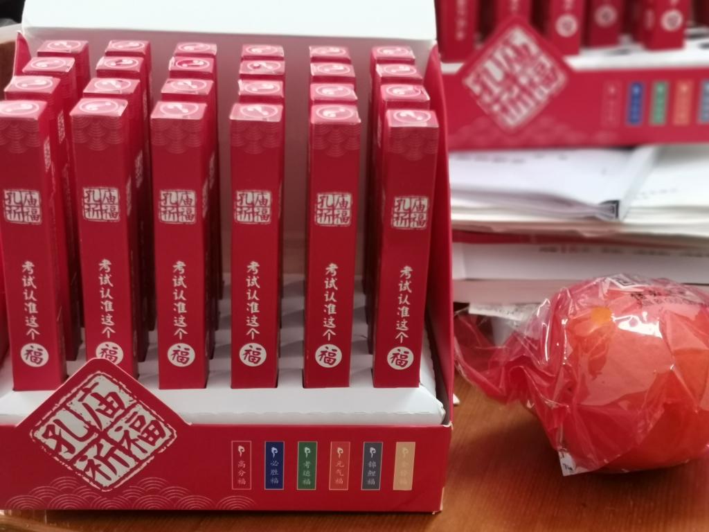 老师们为考研学子分发象征心想事“橙”的幸运橙子,并请学子们抽取孔庙祈福“盲盒”,盲盒中分别有象征高分福、必胜福、考运福、元气福、锦鲤福、金榜福的六种中性笔,表达麻豆在线