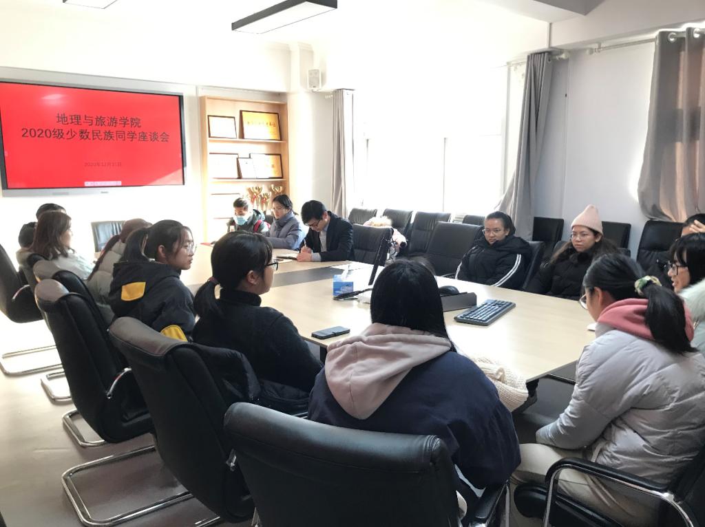 在会馆2401召开2020级少数民族同学座谈会。辅导员田青、张乃宁,以及少数民族同学参加了座谈会。