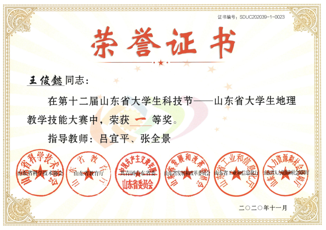 获奖情况:2020年山东省大学生地理教学技能大赛一等奖