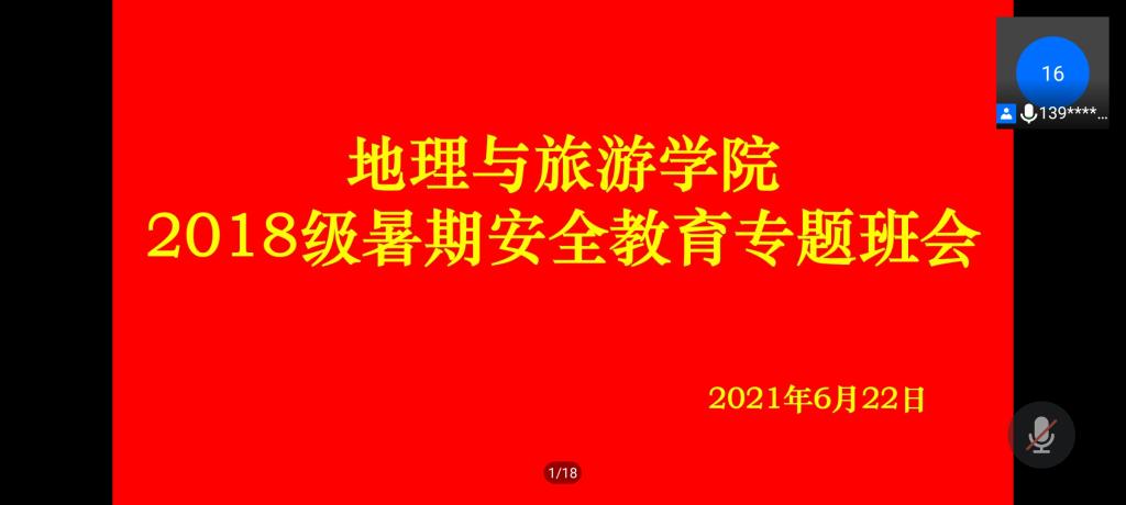 召开2018级线上“暑期安全教育”专题班会。班会由辅导员宁晓文主讲,2018级全体学生参加。