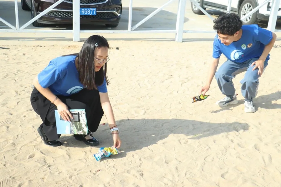 实践队成员在沙滩捡拾垃圾