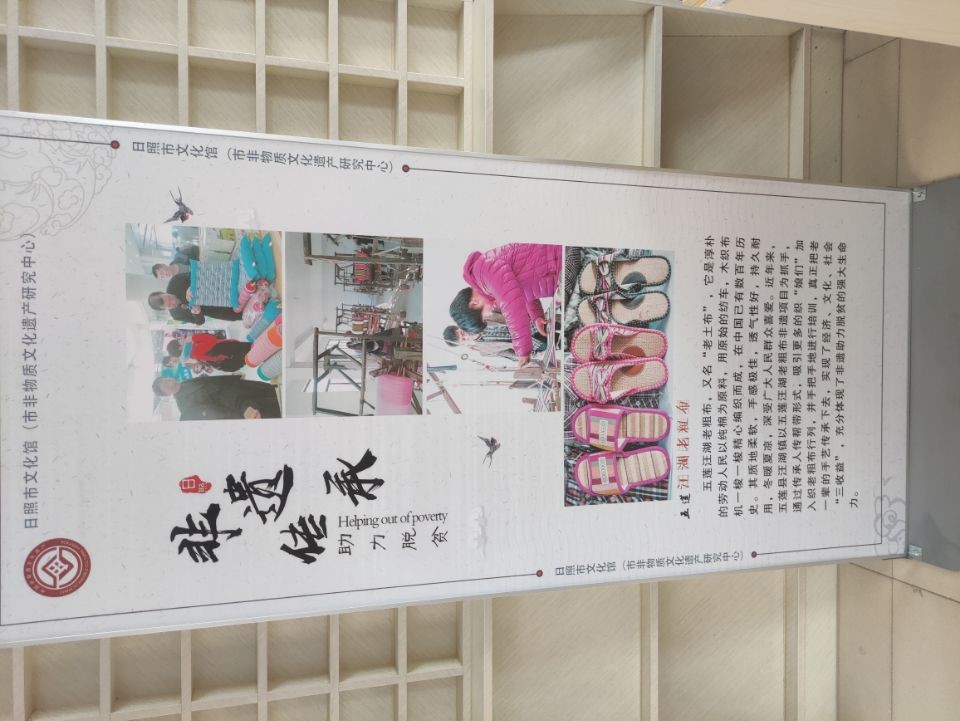 “就脱贫而言,除了影雕这一块,还有岚山的新编草甸还不错。这虽然时间比较久远了,数据也有点落后,但是是一个成功的案例,他们乡村也是召集一些人来帮他们加工一些产品,有一个店专门卖。现在而言脱贫这个词不太合适了,现在是乡村振兴。而且东港区这些乡村都不是很偏僻,像局限,五莲倒是还有一些,我们就是展厅里,那个老粗布,算是比较大,比较典型的了。非遗工坊我们这现在是建了很多,建成了76个,当时建这个工坊不是单纯为了乡村振兴,只是为了让非遗实现创新性发展和创造性转化,让非遗传承人增加收入,所以当时就推荐一下适合的项目。咱们市现在有126项立项了,莒县有416项大约,还是比较多的。现在在五莲做得比较好。”