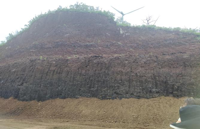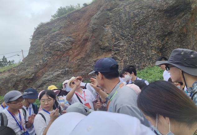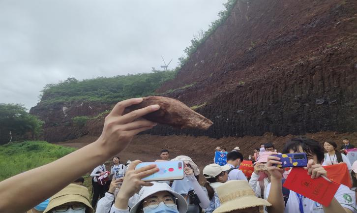 2021年7月30日上午9点,实习成员来到史家沟。在鲁东大学金秉福教授的带领下,共同观察学习了史家沟多期玄武岩、柱状节理、古风化壳、烘烤层、火山碎屑层;实习队员在自行考察的过程中,找到玄武岩中的橄榄石包晶。