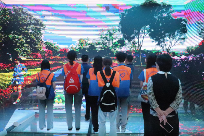 “创新驱动发展,科技引领未来”,互联网+旅游新态势稳步发展,山海天旅游度假区秉承着这个理念,推动该地旅游业蓬勃发展。在山海天旅游度假区文化和旅游局副局长李苇的带领下,“小海螺”实践队进入了日照市山海天游客服务中心一楼演播大厅,此大厅是山海天旅游度假区建设的一个沉浸式数字沙盘展示系统,利用一个包含上、下、左、右和前方五面的LED屏,结合3D影像技术,游客们站在中心的玻璃平台上,可以有一种身临其境的感觉。通过观赏动画,游客们可以了解日照市和山海天旅游度假区的旅游资源、旅游发展现状、发展前景和发展历史等信息。数字演播厅的建立,是科技发展的结果。通过数字沙盘展示系统的立体播放,大大提升游客观看短片的体验感,其立体环绕效果更使人身临其境,“小海螺”实践队的队员们沉浸其中,对日照市山海天旅游度假区有了更深的了解。