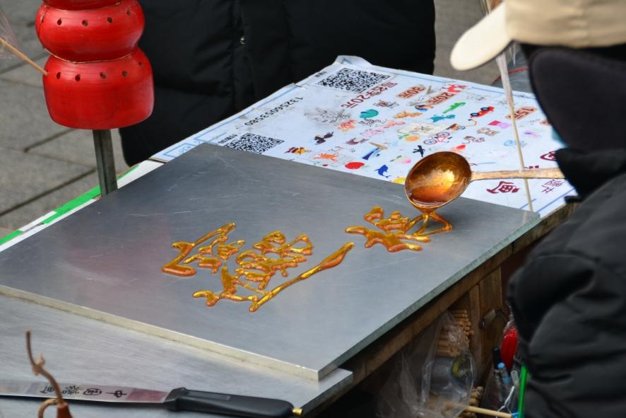 深巷里,小小的摊位,各式各样的糖画,沉稳的郑师傅将麦芽糖熬制成粘稠又可以流动的半固体,用专用的糖画勺子舀取一勺锅中的糖浆。随后控制勺子在光滑的铁皮桌面上绘制出令人赞不绝口的图案,写下遒劲的汉字。金黄的糖浆,行云流水的动作,一气呵成的图案,郑师傅熟练地画出栩栩如生的动物;用糖作墨,以勺为笔,写出颇具风骨的文字。看到郑师傅的样子,我心里便觉得原来糖画如此简单。当我胸有成竹的拿起装满糖浆的勺子,事情却变得不简单起来。我并不能像郑师傅一样完美地控制糖浆的流量,导致画出来的线条粗细不一;我不能像郑师傅一样使用的力度恰到好处,导致画出来的线条弯弯曲曲;我不像郑师傅一样绘画技术和毛笔字基础深厚,导致做出来的图案并不美丽。郑师傅告诉我们,制作糖画要有耐心,要多练习,养成耐心和坚韧的意志力是做任何事情成功的关键,从小积累书法基础更是十分重要。郑师傅语重心长地说,世上无难事,只怕有心人。只有当你对这件事投入热爱并坚定不移,才可以把事情做完美。