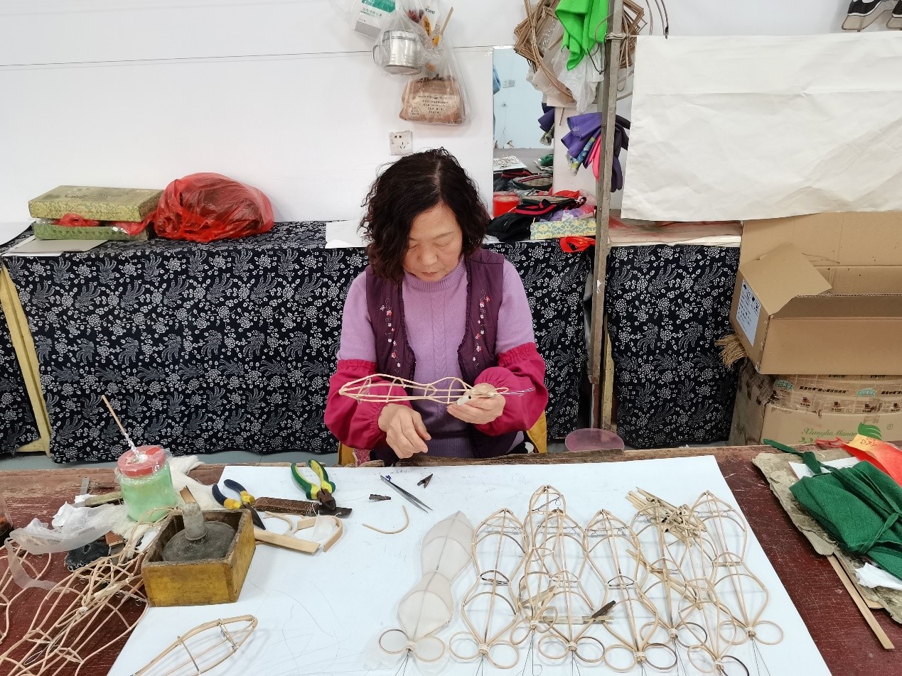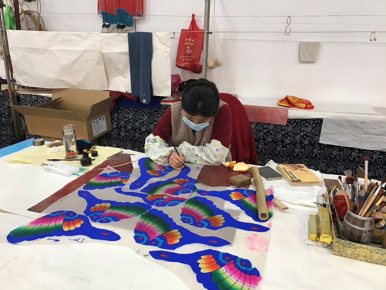 为了进一步了解风筝的历史以及它的制作工艺,我们来到了杨家埠风筝扎制作坊,一览风筝的制作过程。进入作坊,首先映入眼帘的就是满墙的风筝,巧夺天工令我们眼花缭乱。据这里的师傅介绍,风筝的制作分“扎、糊、绘、放”四项工作,而这里制作风筝的师傅也都有二三十年的经验。寻迹小队的队员随机采访了几位师傅,了解到了一些有关风筝的知识,得知杨家埠制作的风筝上的图案都是一笔一画描绘出来的;并且这种手工风筝描画用的颜料都是特殊制作的,这样颜色会比印刷上去的更加稳定。随后,师傅向实践队员们展示了风筝的制作过程,风筝张开的双翼,好似展翅而飞的雄鹰,纸与木的交融,刻意求工创造出精妙绝伦的工艺品,须臾之间诞生的艺术,却凝练了每一位师傅数年的心血。