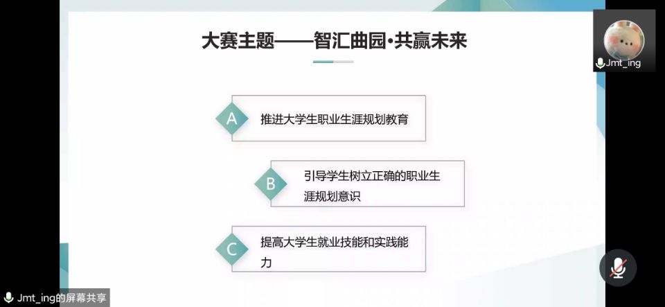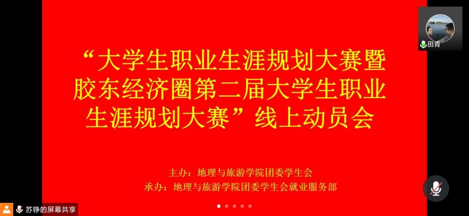 于1月26日举办”大学生职业生涯规划大赛暨胶东经济圈第二届大学生职业生涯规划大赛”线上动员会。2018级辅导员田青出席会议并作动员讲话,就业服务部部长贾梦婷、职业生涯规划大赛优秀代表陈文欣、姜怡合分享赛事经验。