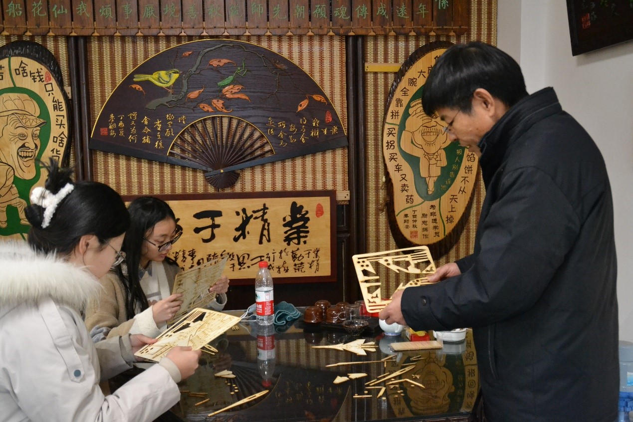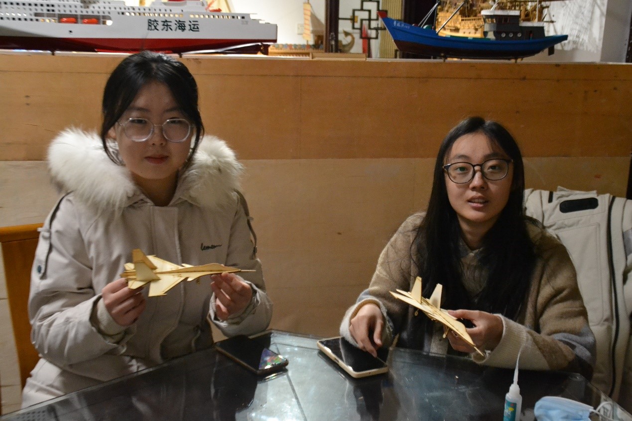随后,秦师傅向队员们介绍了威海船模的发展历程。据秦师傅介绍,船模即船模型,是依照真船的形状、结构、色彩,甚至内饰部件,严格按比例缩小制作的比例模型。而威海船模是由威海的地理环境、祭祀民俗、特定历史等要素共同作用从木雕花船沿革而来,具有鲜明的威海本土地域特色和人文特色,是北方船模的重要代表。秦师傅还介绍到,船模最初是渔民出海前放在天后宫、龙王庙用来祭祀的供品,祈求平安和满载而归。英国租借威海卫以后,由于英国人对大海特殊的情结,来威海的英国人看到小巧的木雕花船十分喜爱,于是买来做纪念品。后来外国游客不断增多,船模的需求量越来越大,类型也愈加丰富,从单一的木质渔船、古战船、货船,到多种材质的巡洋舰、快艇、潜艇等舰艇的模型,船模成为当时最受外国游客青睐的旅游工艺品之一。时至今日,人们对船模又赋予了新的文化内涵。由于帆船模型上带有桅杆和风帆,寓意着“一帆风顺”的美好期许,成为人们馈赠亲友的极佳礼品。
