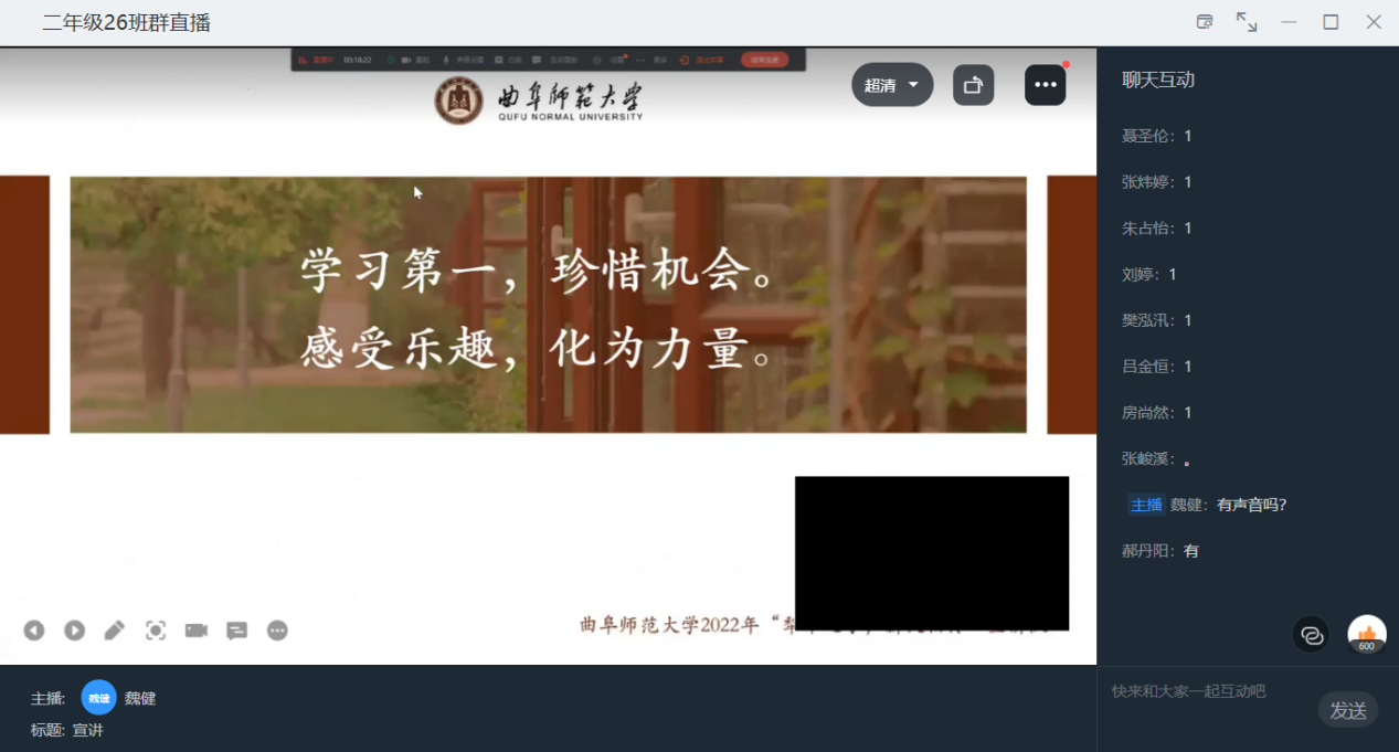 由于疫情在全国范围内持续扩散,淄博六中因此提高了防疫要求,队员们无法进入教室与高中学生面对面交流,于是决定举行线上宣讲会。队员联系到2020级26班班主任魏健老师,此时的魏老师正在为一次“直面挫折,逆风飞扬”的班会课而忙碌,学生对于考试的恐惧、面对挫折的脆弱等问题让他有些为难。得知队员们想要举行宣讲会时,他发出邀请,希望队员们能结合自己的经历,提出一些建议,帮助他的学生们走出困境。