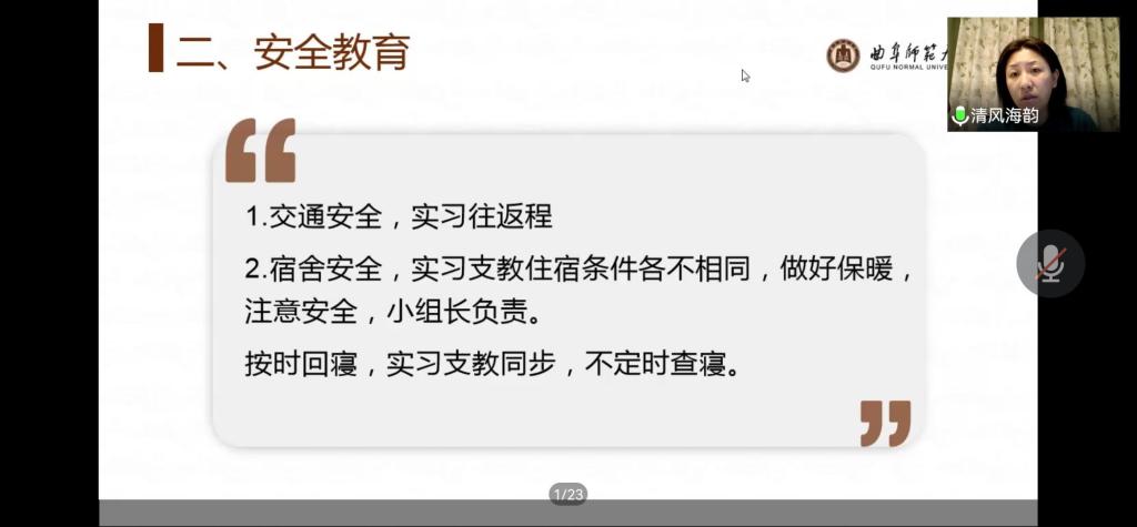 主题班会上,辅导员老师分别从疫情防控工作、实习支教安全、学风建设、校园安全、考研就业等方面开展宣讲。李梅老师希望2019级同学们要明确自己的职业规划,制定合理的人生目标,奋发学习,在教育实习中增长才干,寻找自己的人生定义。田青老师号召同学们注意消防安全、交通安全、人身安全、财产安全,安全用电,合理上网,坚决杜绝乱搭电线、杜绝安全隐患;在疫情防控常态化时期,要继续坚持“非必要不外出”原则,按时报告个人健康信息,坚决落实好疫情防控责任;在疫情防控特殊时期,要合理安排毕业论文撰写、考研复试、考公考编、就业择业等,防范就业领域的诈骗。张乃宁老师鼓励同学们刻苦学习,充分利用时间做有意义的事,加强体育锻炼增强体质;在强化专业课学习的同时,要积极参与科创类比赛,不断提高自身综合素养,提前做好生涯规划。董青老师希望同学们养成良好的学习习惯和生活习惯,引导同学们遵守学校的规章制度,以饱满的热情和激昂的斗志迎接新学期的到来。