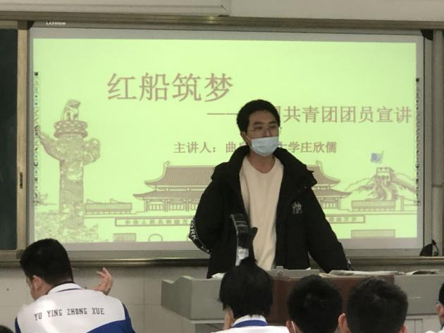 踏进校门,焕然一新的学校瞬间吸引了我们的注意,白驹过隙,学校已经发生了翻天覆地的变化,馥郁芬芳的花园;空旷平整的球场;高级完善的设备,这一切的改变都离不开党和国家对于教育工作的重视和支持。来到班级团支部,我们立刻就感受到了浓厚的学习氛围:由于临近期末,尽管是在课间,所有同学都在奋笔疾书,没有一丝嘈杂,以至于我们有些不忍心打扰;也担心同学们比较内向,导致宣讲时气氛比较沉闷。但是宣讲一开始,这种顾虑瞬间就没有了:同学们对进一步了解中国共青团表现出了热情和积极,提出有关团基础知识的问题时,同学们争先恐后地积极回答;讲到关于团光辉历史的事件时,同学们全神贯注地侧耳倾听;分享对于团核心精神的理解时,同学们跃跃欲试地分享答案。在同学们的热烈掌声中,我们圆满结束了此次班级团支部的宣讲。我们感觉非常开心与自豪:一方面,我们欣喜于自己的辛苦准备获得了肯定,为中国共青团的宣传尽了自己的一份绵薄之力;另一方面,我们更为我们的师弟师妹们而骄傲,青年如初春,如朝日,如百卉之萌动,如利刃之新发于硎,人生最可宝贵的时期,他们未来将会为党的发展和民族的复兴贡献出自己的力量。新年伊始,理想在暖阳的灌溉下悄然发芽,和煦的微风拂面。彼时,天上太阳正晴,风光大好,可与理想共赴韶华。
