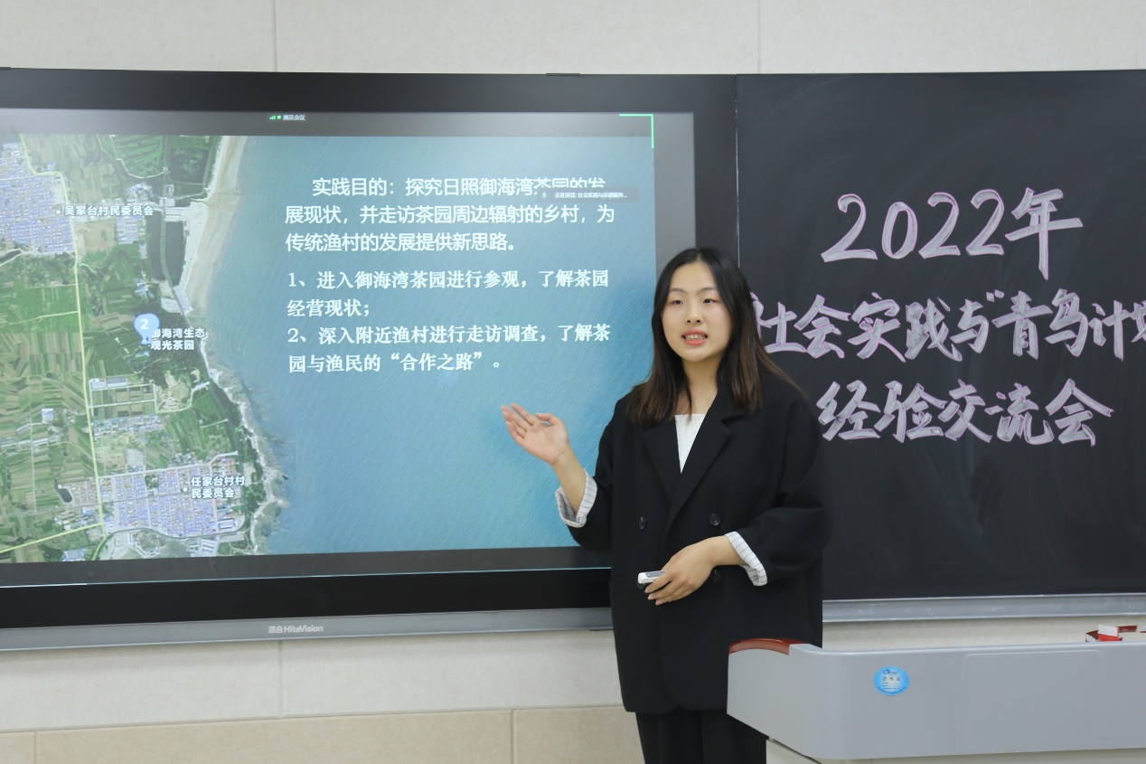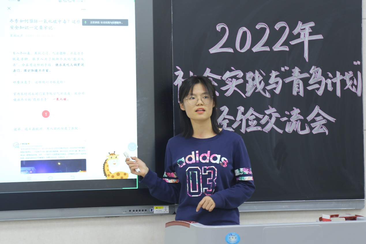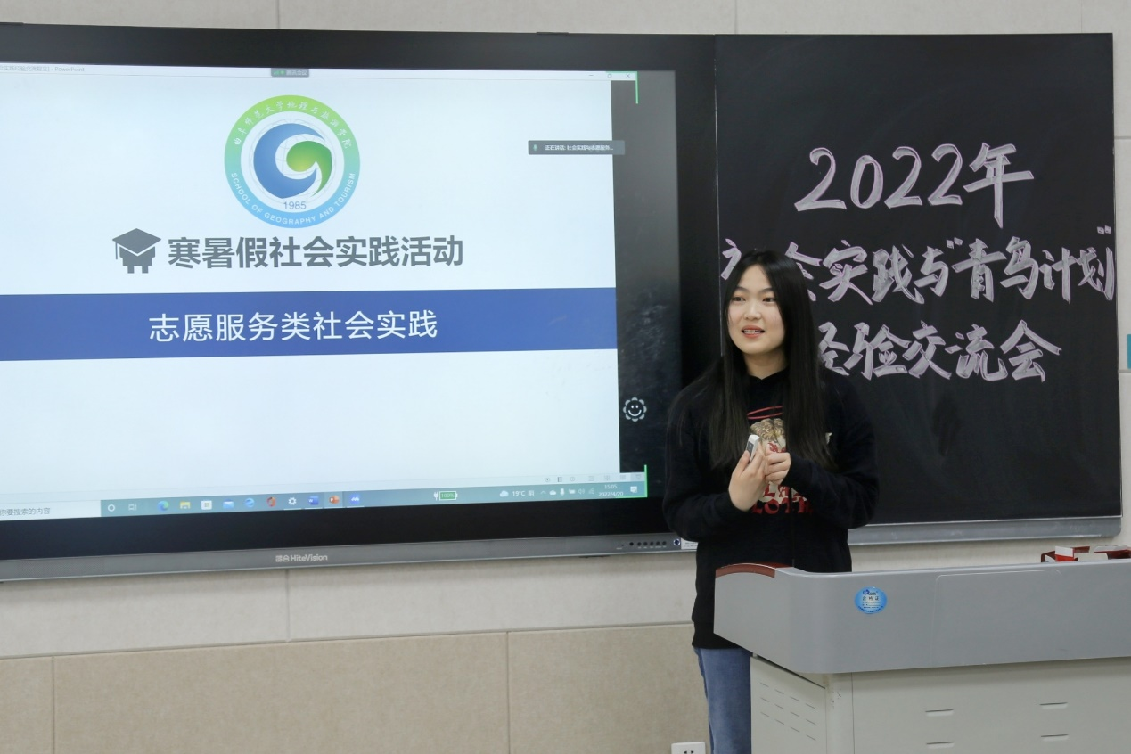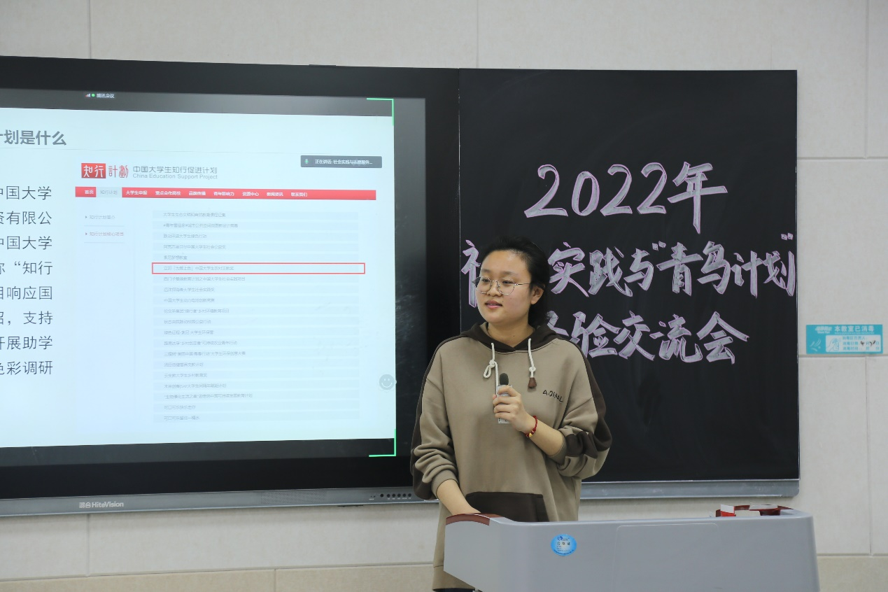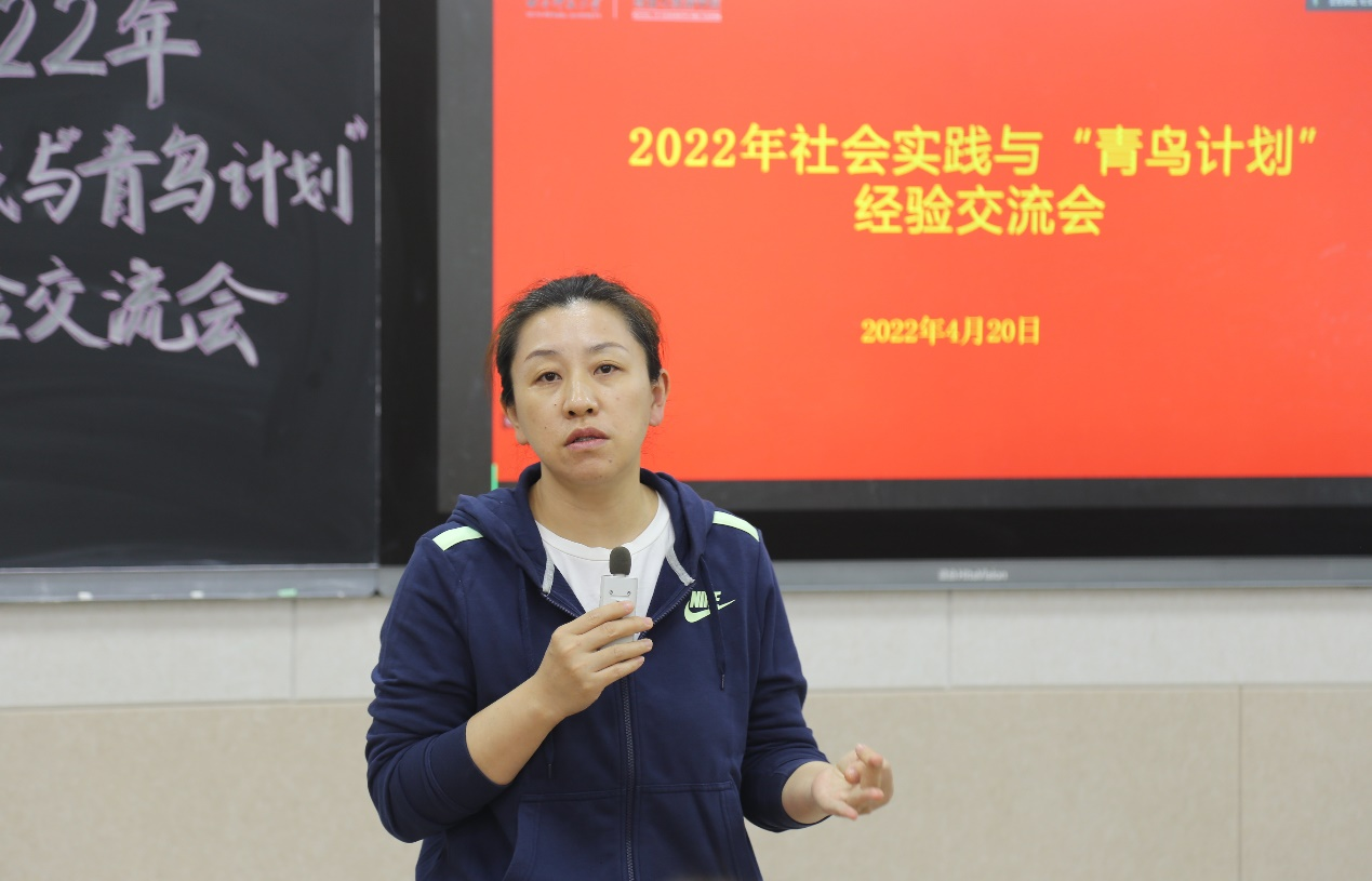 经验交流会上,李梅阐述了社会实践和“青鸟计划”对升学考研、创新创业、自我提升等方面的重要性,鼓励大家积极投身到社会实践和“青鸟计划”之中,促进成果转化,并希望大家能够保证社会实践的数量和质量,在日后继续创造佳绩。会上,邱玥、程立、李翼展分享社会实践经验。邱玥详细介绍了“知行计划”的基本信息,围绕前期准备、学校选择、计划制定等方面给出建议;她分享了支教过程中作为一名老师与孩子们相处的真实感受,也针对教学方面如何开展课程、宣传方面如何向社会传递正能量提出自己的见解。程立讲解了志愿服务类的社会实践经验;她结合自己带队经历,教给大家如何安排实践活动、如何做好后期宣传;她叙述了社会实践不同阶段的注意事项,鼓励大家提前做好计划,并结合时事,升华社会实践的主题。李翼展将社会实践总结为“起”、“承”、“转”、“合”四个部分;她为如何开启社会实践提供思路,讲解了在社会实践过程中如何结合专业特点;鼓励大家以探索求知的精神解决实际问题,将论文写在大地上,做一名对社会有用的青年学生。