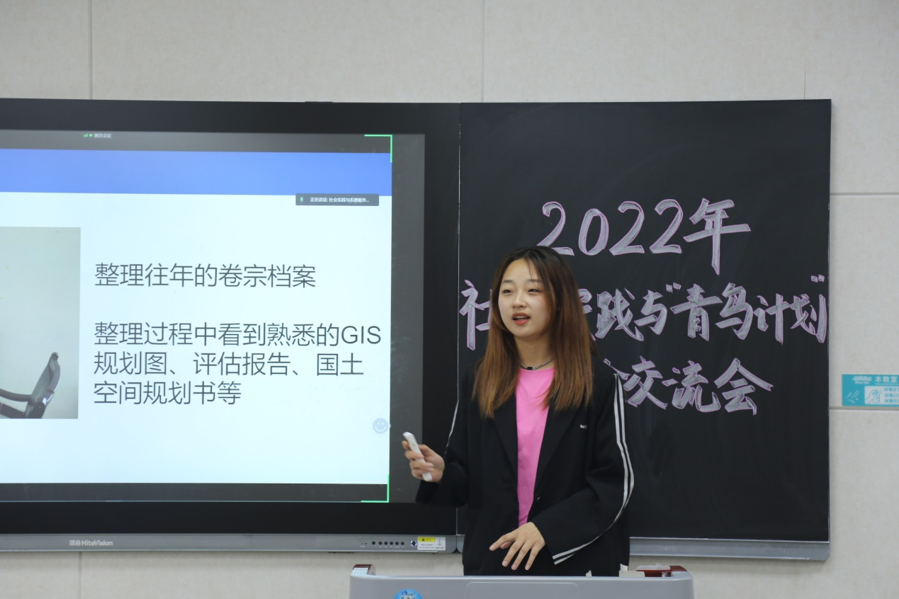 经验交流会上,王菡、梅云婷分享了参加”青鸟计划“的实习经历。王菡分享了自己在自然资源和规划局实习的所见所闻,从参与方式、主要工作、经验收获等展开介绍;她讲述了实际工作过程中发现的动人场景和励志故事,对激励大家参与”青鸟计划“起到促进作用。梅云婷分享了在街道办事处的实习经验;她讲述了在基层工作中看到的温情故事,讲述自己的感悟和体会,也展示出在”青鸟计划“中获得的丰硕成果,表达了自己在工作中所认识到的脱贫致富、乡村振兴的真正意义。
