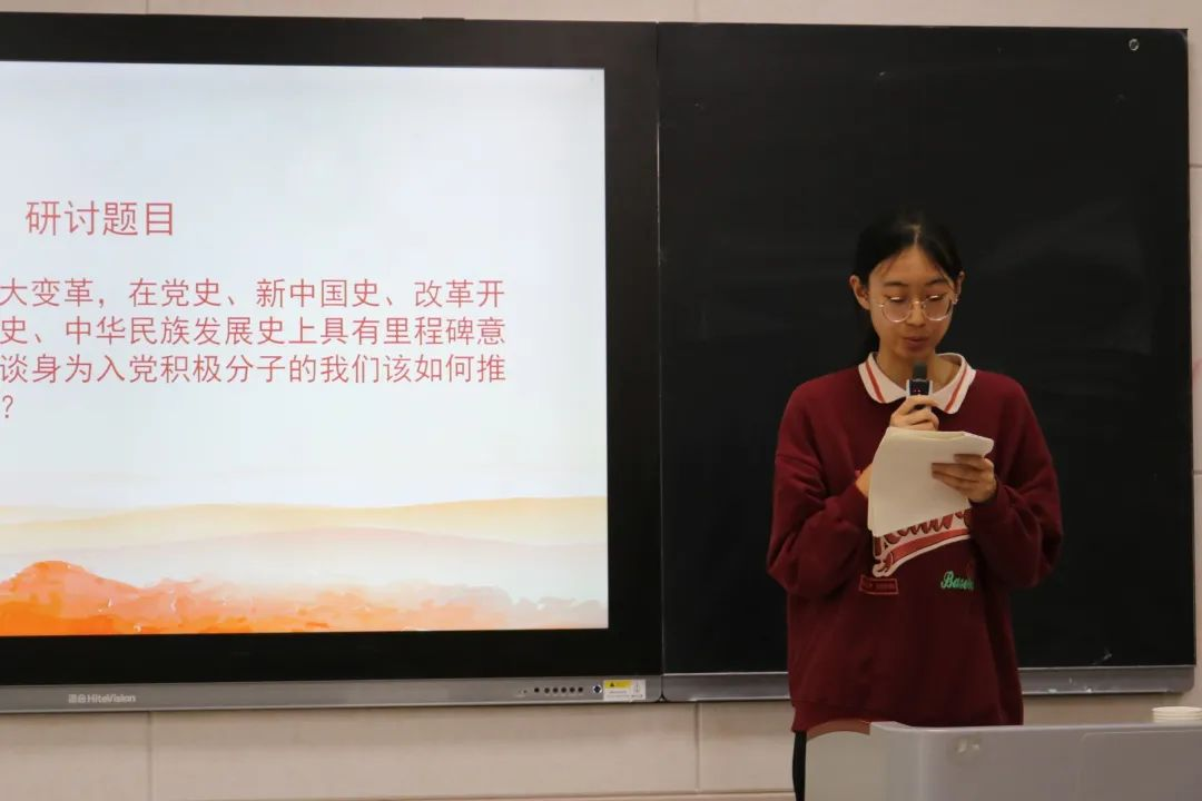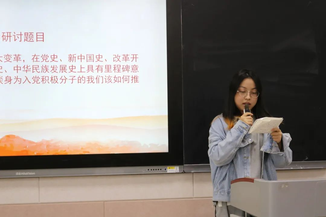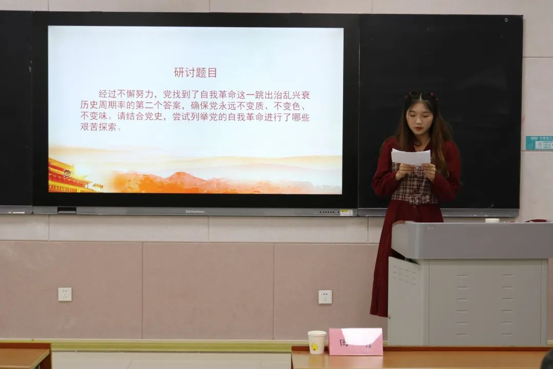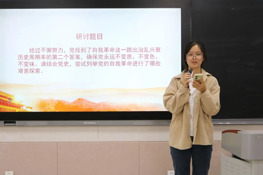 研讨第一部分,感悟党的自我革命所进行的艰苦探索。入党积极分子代表学习和介绍了建党以来的多次具有里程碑意义的自我革命,说明党的自我革命的重要意义。他们说到,勇于自我革命是中国共产党区别于其他政党的显著标志,自我革命精神是党永葆青春活力的强大支撑,身为时代青年,要加强对党史和时事的学习,树立自省意识,坚持守正创新,坚持自我革命,筑牢信仰之基,补足精神之钙。