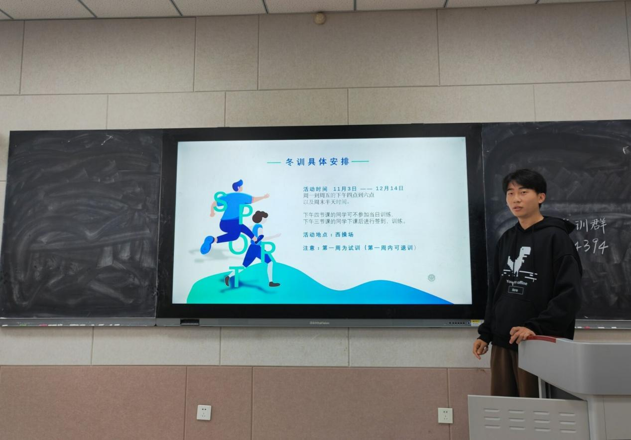 宣讲中,体育部成员以照片、文字的形式展示往年冬训过程中地理学子的优秀风采,并对时间地点、训练内容、请假制度等在内的冬训具体安排进行详细介绍,建立同学们对冬训的清晰认识。同时,体育部提到,冬训过程中可以接受专业指导,具有强身健体、瘦身塑形、强化疫情防控的积极意义,也将在冬训中进行运动会队员的选拔,引起同学们的高度热情。最后,体育部鼓励全体同学,在冬训中锻炼身体,磨炼意志,丰富课余生活,拥有健康体魄,希望同学们积极参与。