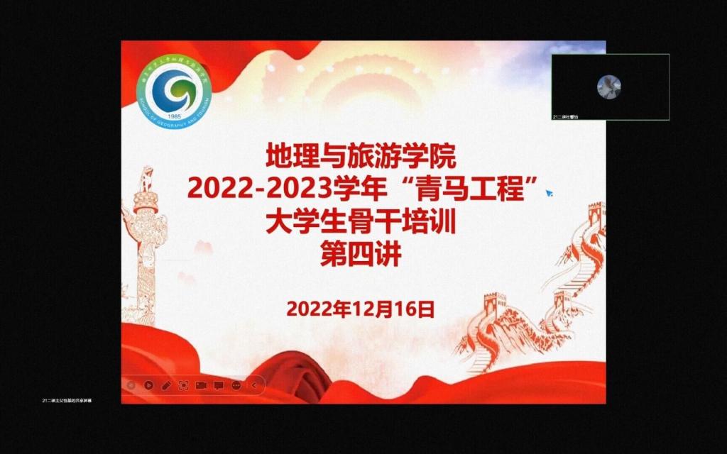 举办2022-2023学年“青马工程”第四期——“榜样的力量”专题宣讲活动。第二课堂工作部副部长杜馨怡主持,2019级优秀学生代表韩梦甜、张晓云主讲,2021级入党积极分子和2022级全体学生参加。