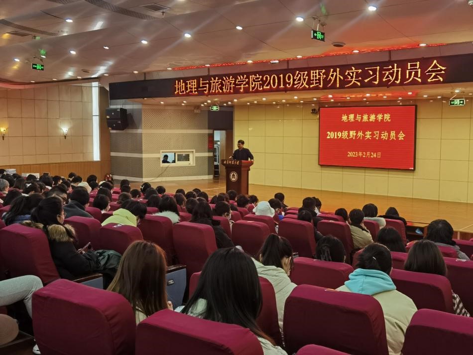 于图书馆报告厅举行2019级野外实习动员会。学院院长张全景,党委副书记刘伟,党委委员刘志刚及2019级辅导员李梅出席,2019级全体同学参加会议。副院长吴军主持动员会。