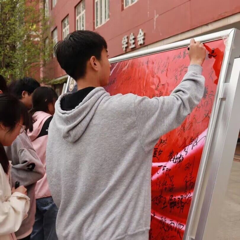 师生纷纷在签字板上签名留影。