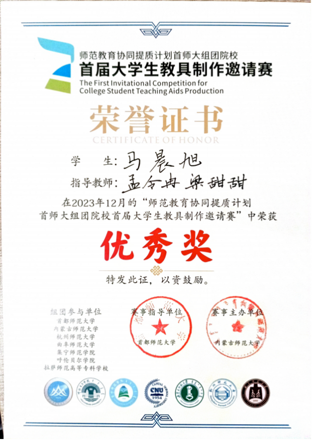 学子表现突出,取得优异成绩。张雨雯、张誉文、周小惠同学(指导教师:周维国)的作品《五大地形地貌》,袁欣然、袁雨霞、岳依凡同学(指导教师:周维国)的作品《火山地貌及景观教具》获得二等奖。杨子涵、杨中冉、于佳卉同学(指导教师:王伟)的作品《河流地貌模型教具》,马晨旭、付丰赫、纪晓萱同学(指导教师:孟令冉、梁甜甜)作品《探索太阳系》获得优秀奖。本次竞赛为学生搭建了展示师范技能的平台,充分展示了麻豆在线