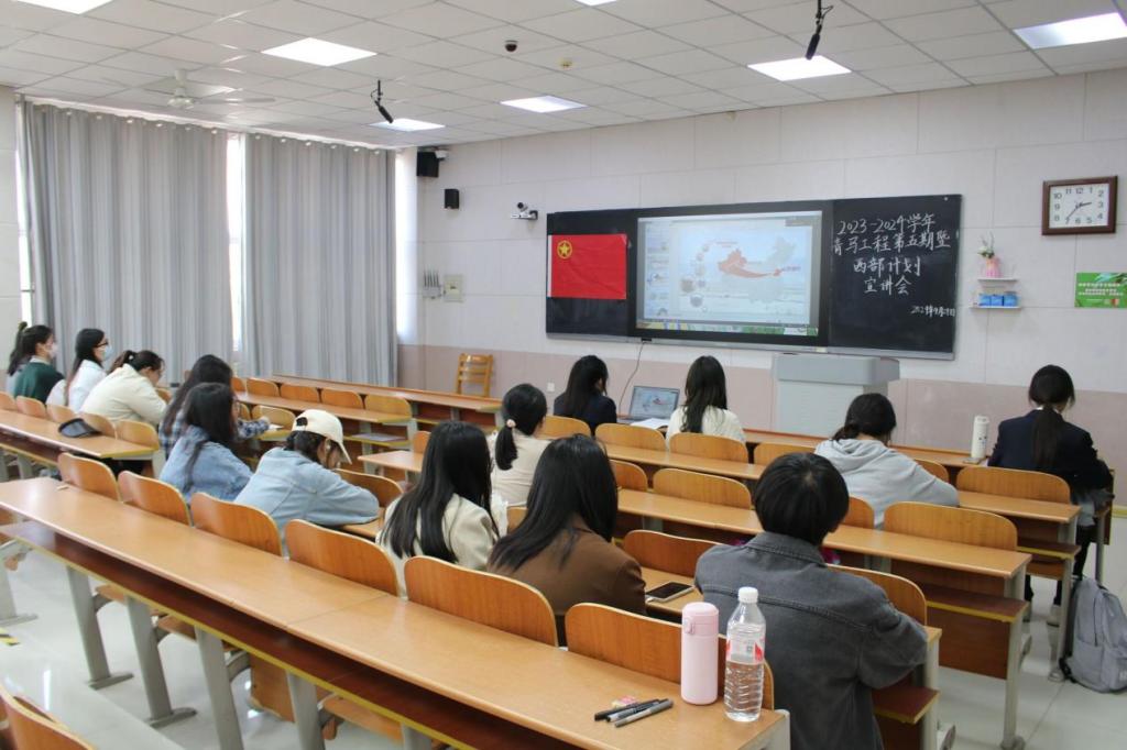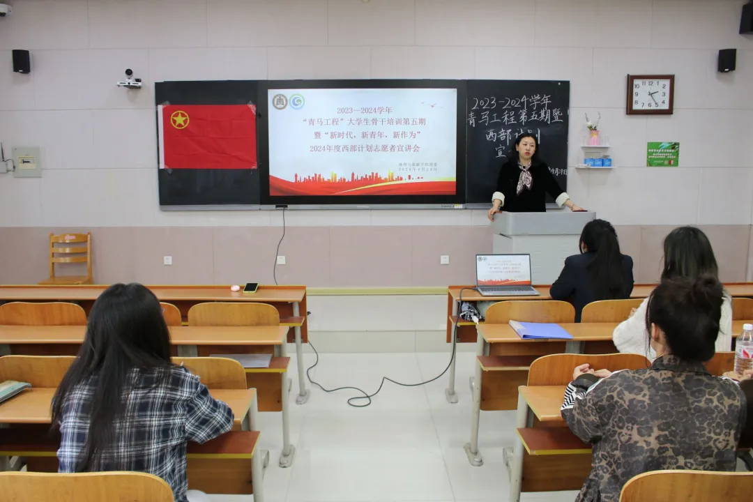 于S206举办2023-2024学年“青马工程”第五期暨大学生志愿服务西部计划宣讲会。学院团委书记李梅出席,往届西部计划毕业生姜伟、汲中俊、邵家荣进行线上宣讲,2022级部分同学参加。