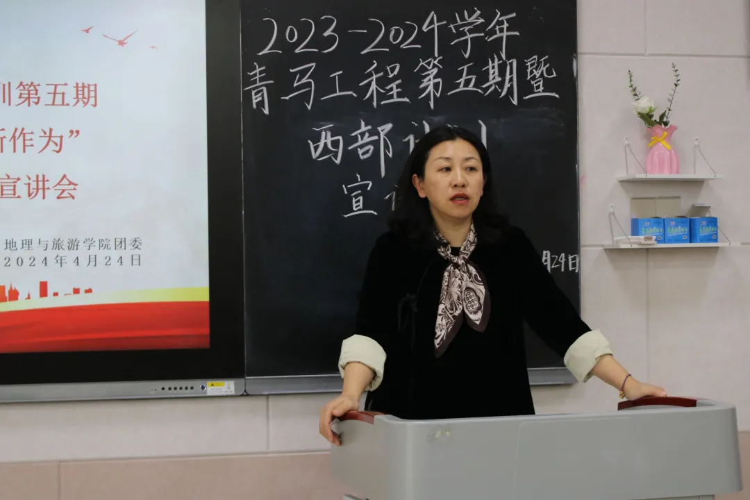 活动伊始,李梅围绕此次青马工程和西部计划的联合举办,开展全方位的讲述。她重点强调西部计划的重要意义,讲述了大学生参与西部计划的选岗情况、遴选情况及优惠政策。她鼓励同学们抓住机会,把握当下,积极支援服务西部,投身西部建设,努力践行“到西部去,到基层去,到祖国和人民需要的地方去”。