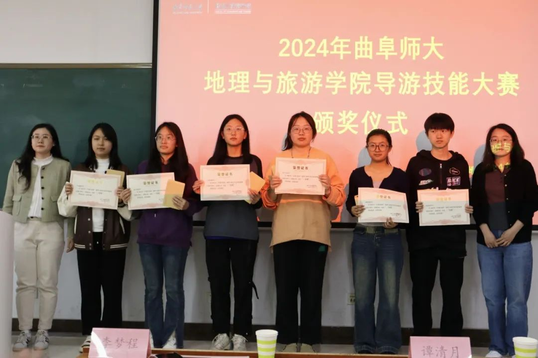 导游服务技能大赛获奖选手颁奖。获一等奖的盖艺蔚、罗雅文同学现场进行导游技能展示,胡圣才、韩笑、石峰详细提出了指导意见。